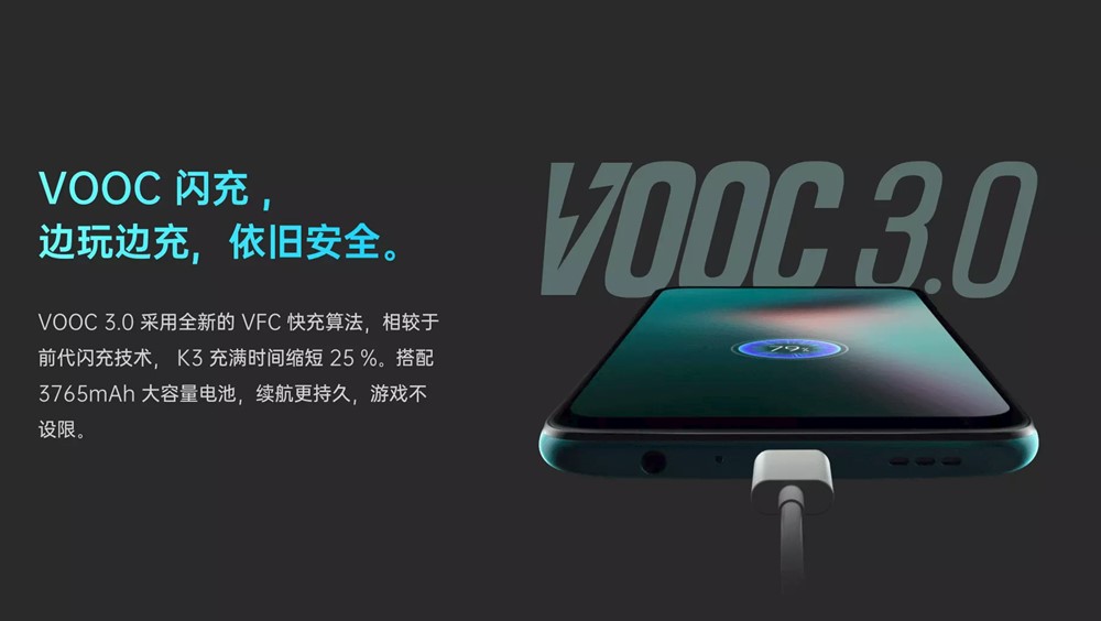 ▼バッテリー容量は3765mAh。VOOC 3.0の超急速充電に対応します。↓