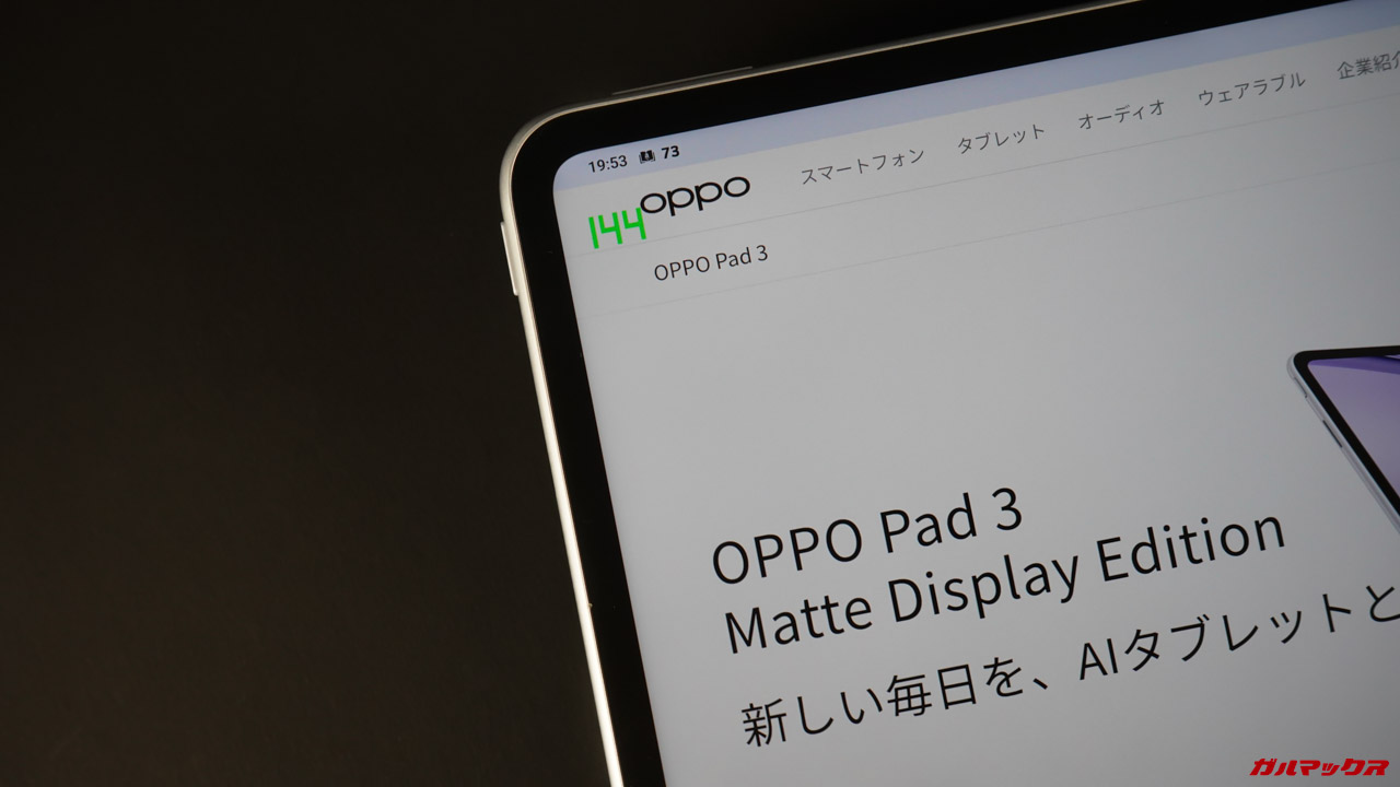 OPPO Pad 3 Matte Display Editionのディスプレイは最大144Hzの高リフレッシュレート(滑らか表示)に対応。大体は120Hz止まりなのでゲーミングディスプレイ並の仕様ですね。