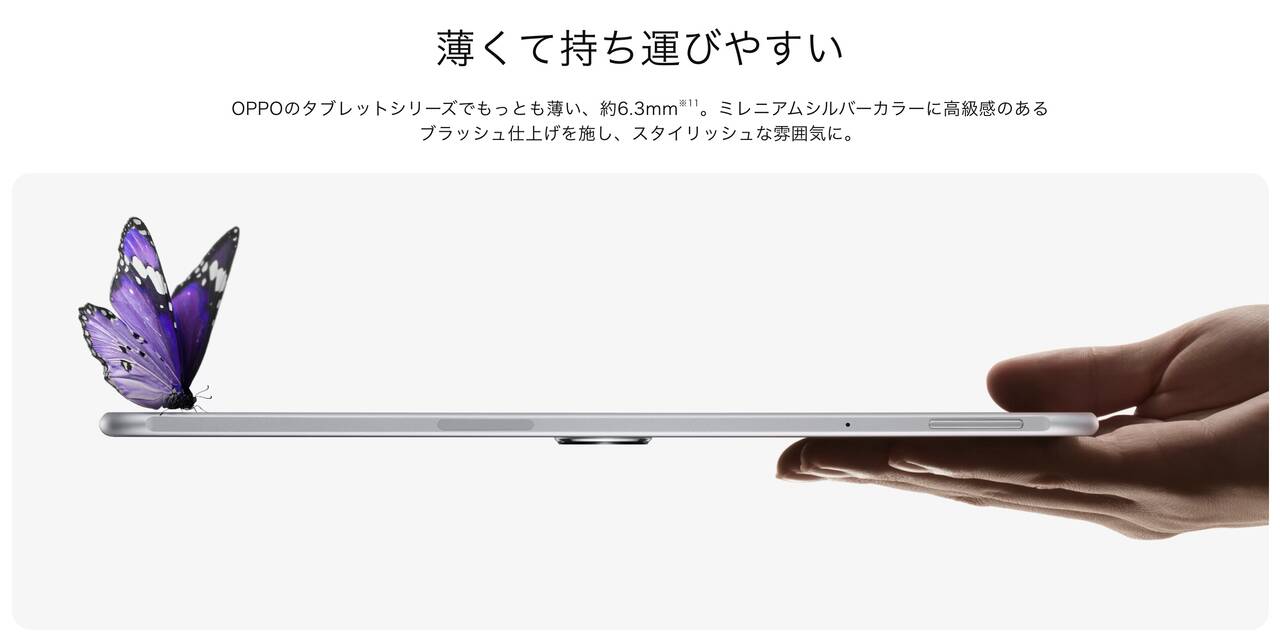 ▼メーカー曰くOPPOのタブレットシリーズで最も薄いとアピールされてます。ちなみに画面サイズは11.6型で厚さはなんと6.3mm。↓