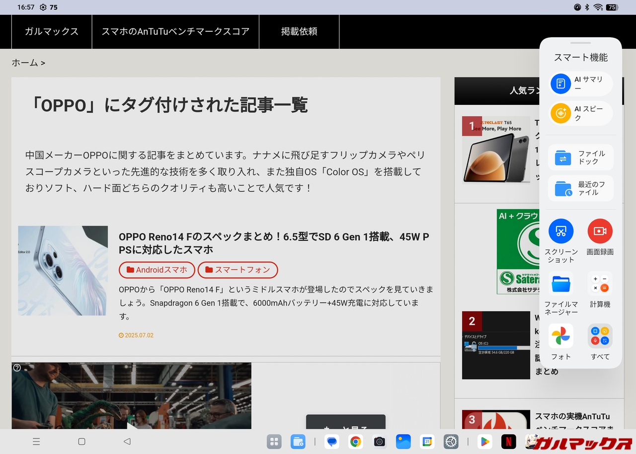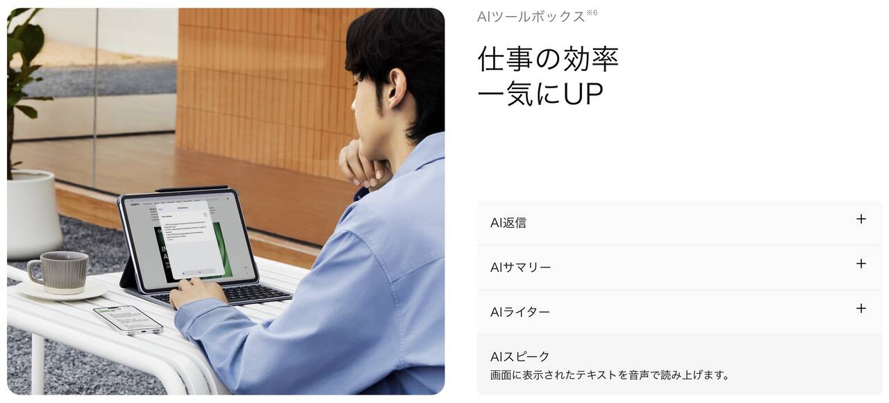 OSはAndroid 15をカスタマイズしたColorOS 15を搭載。iPhoneやiPadと簡単にファイルをやり取りできるO+ Connectに対応、3つに画面分割できるマルチウィンドウビューなど便利機能も盛りだくさん。