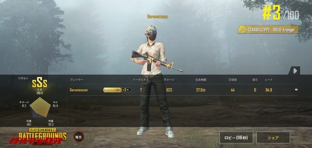 ▼惜しくもドン勝とはなりませんでしたが、数多くのライバルに撃ち勝ち3位となりました。Snapdragon 660でAnTuTuの3D性能は約3万点でしたが、快適に遊べると言えるのはこの位の性能からですね。↓