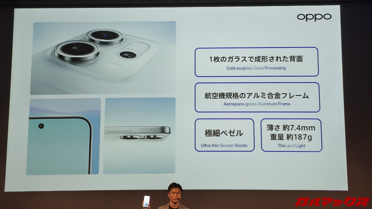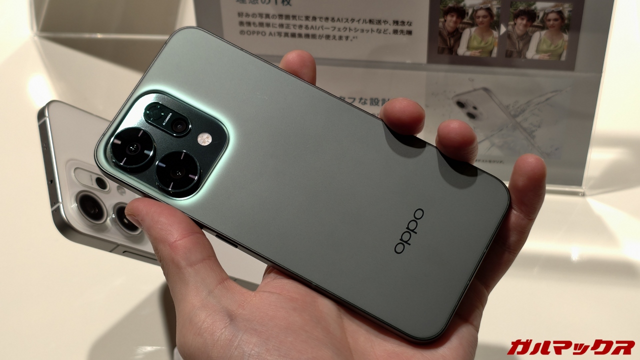 ▼本体素材はガラスとアルミ合金を使用。Reno13 Aと異なり一体成型ではないものの素材の持ち前の耐久性がウリ。高性能ながら重さも187gと控えめになっているのもいいですね(`・ω・´)。↓