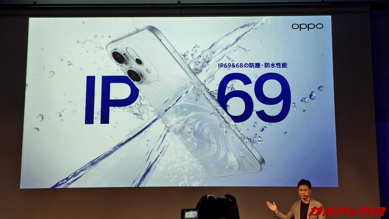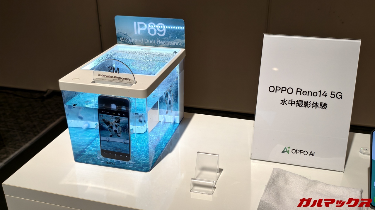 ▼Reno13 Aと同じく本機も完全防水設計!IP69にも対応しておりお湯にも強いことをアピールしていました。↓