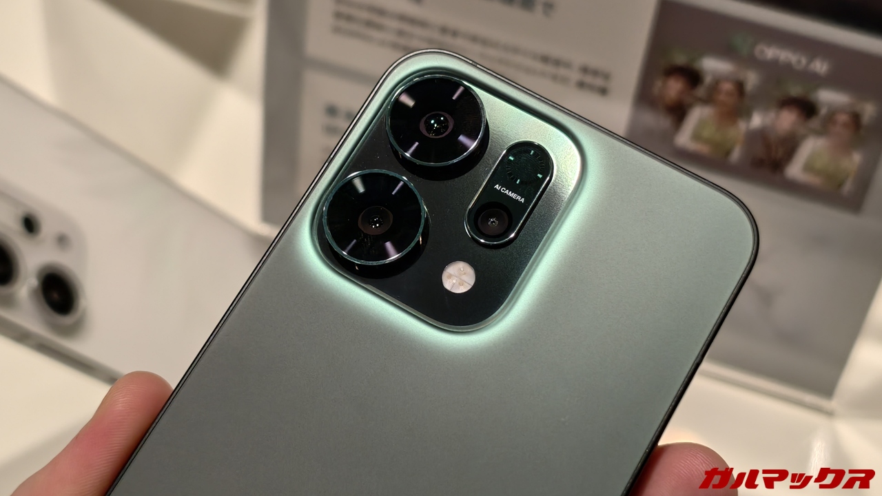 ▼カメラ部分の意匠も特徴的です。Reno13 Aと異なり正方形寄りなサイズ感になっているほか、土台の中にカプセル形状のモジュールが設けられたことで結構メカメカしいし独特な風合いいに。ここでOPPO Reno14 5Gと見分けられそう。↓