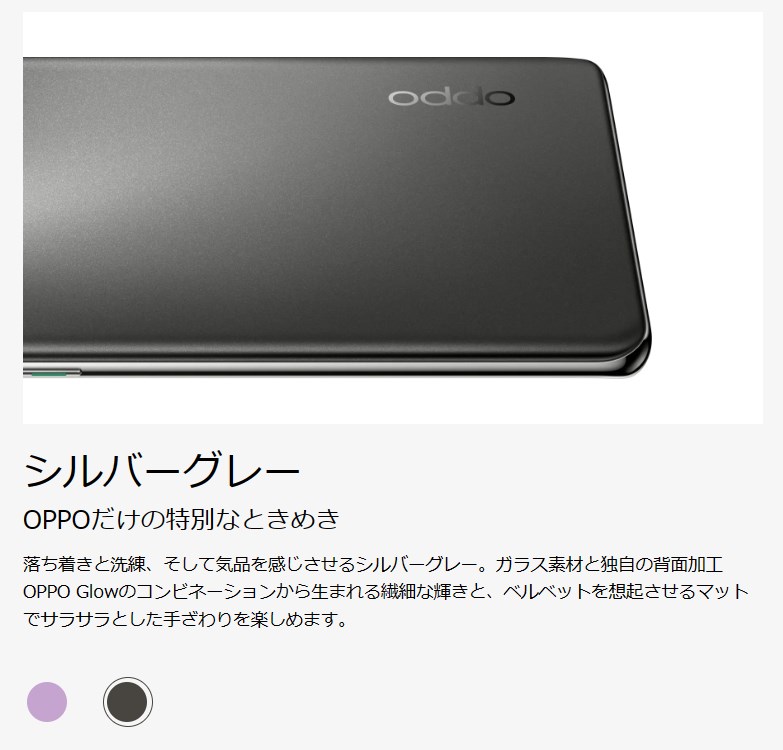▼公式でも「OPPOだけの特別なときめき」「ベルベットを想起させるマットでサラサラとした手ざわり」を銘打っています。↓