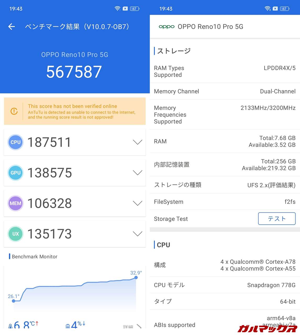 OPPO Reno10 Pro 5GはSnapdragon 778Gを搭載しておりミドルハイクラスの性能です。