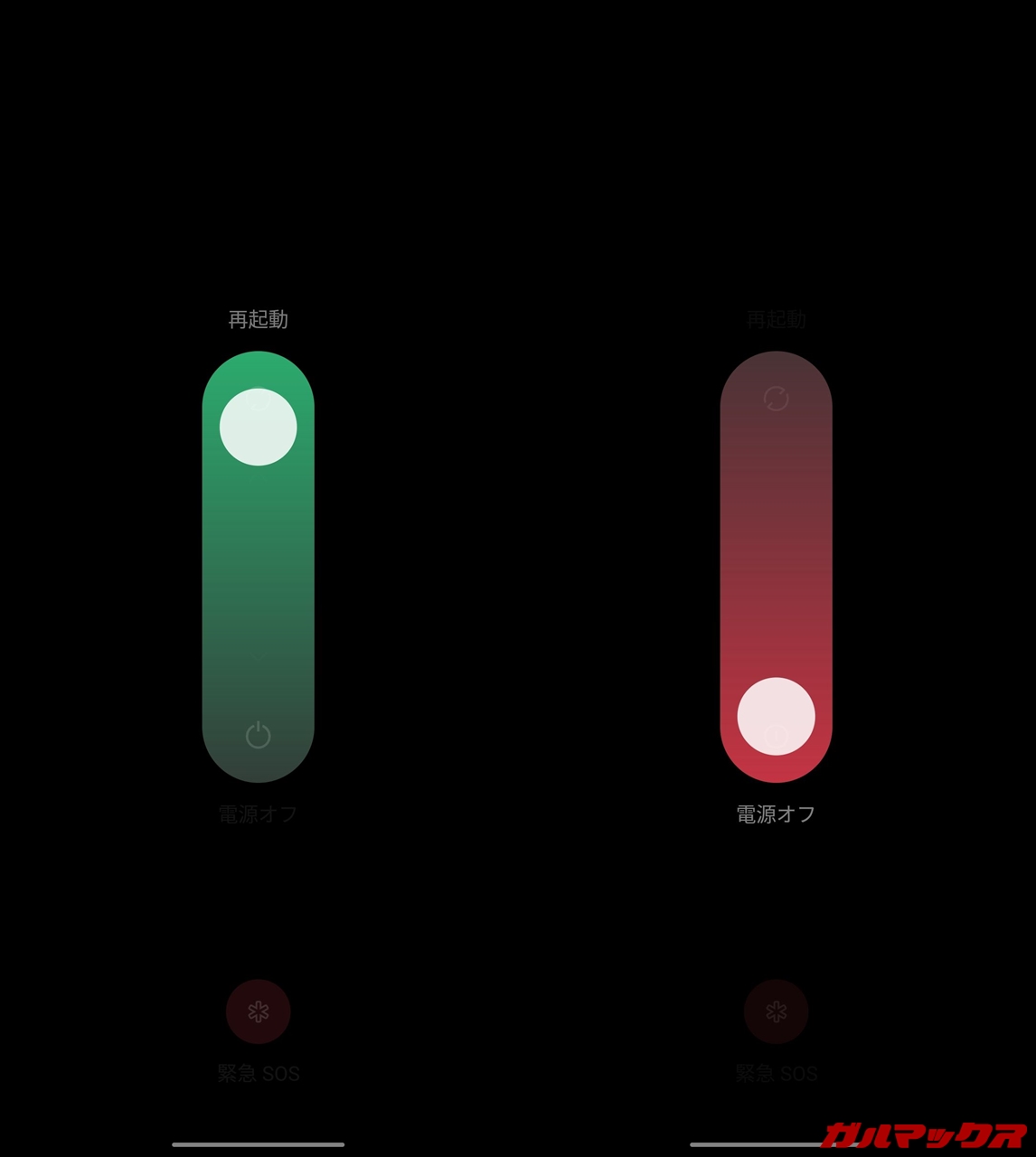 ▼スライダーで電源オフにしたり再起動する方式ですが、ここの色も分けられてるというこだわりっぷり(昔からだけど)。↓