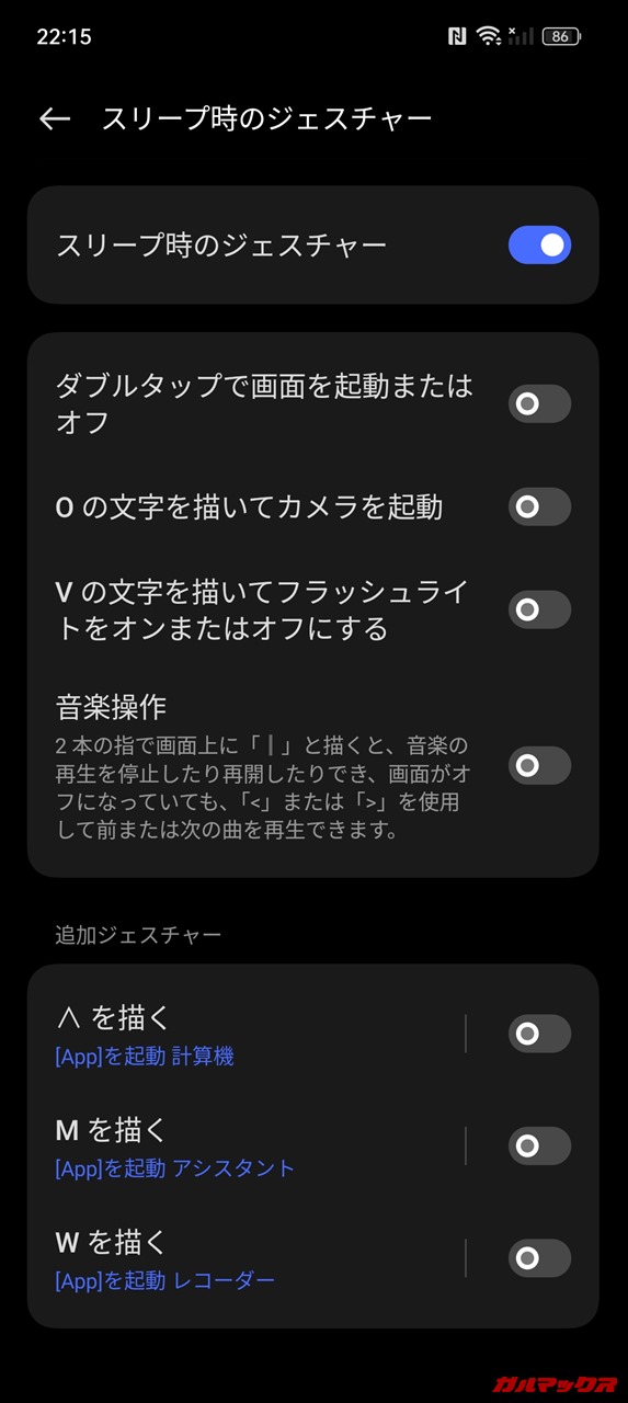 ▼また画面消灯時に特定の文字を指で書くとそれに応じた動作を行えるジェスチャー機能も対応。これもOxygen OSからの逆輸入機能です。個人的には音楽コントロールがかなり便利でオススメ。↓
