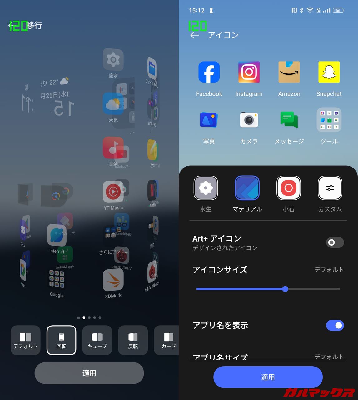 ▼ホーム画面はデフォルトでドロワータイプ。ページ転移のアニメーションやアイコンの外観スタイルの変更も対応していました。↓