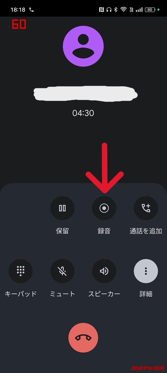 ▼通話画面で詳細を開くと録音ボタンがあり、これを押せば通話の録音が開始されます。また「通話の録音を開始しました」ってガイダンスが自分にも相手にも流れ、迷惑電話の牽制には効果抜群。↓