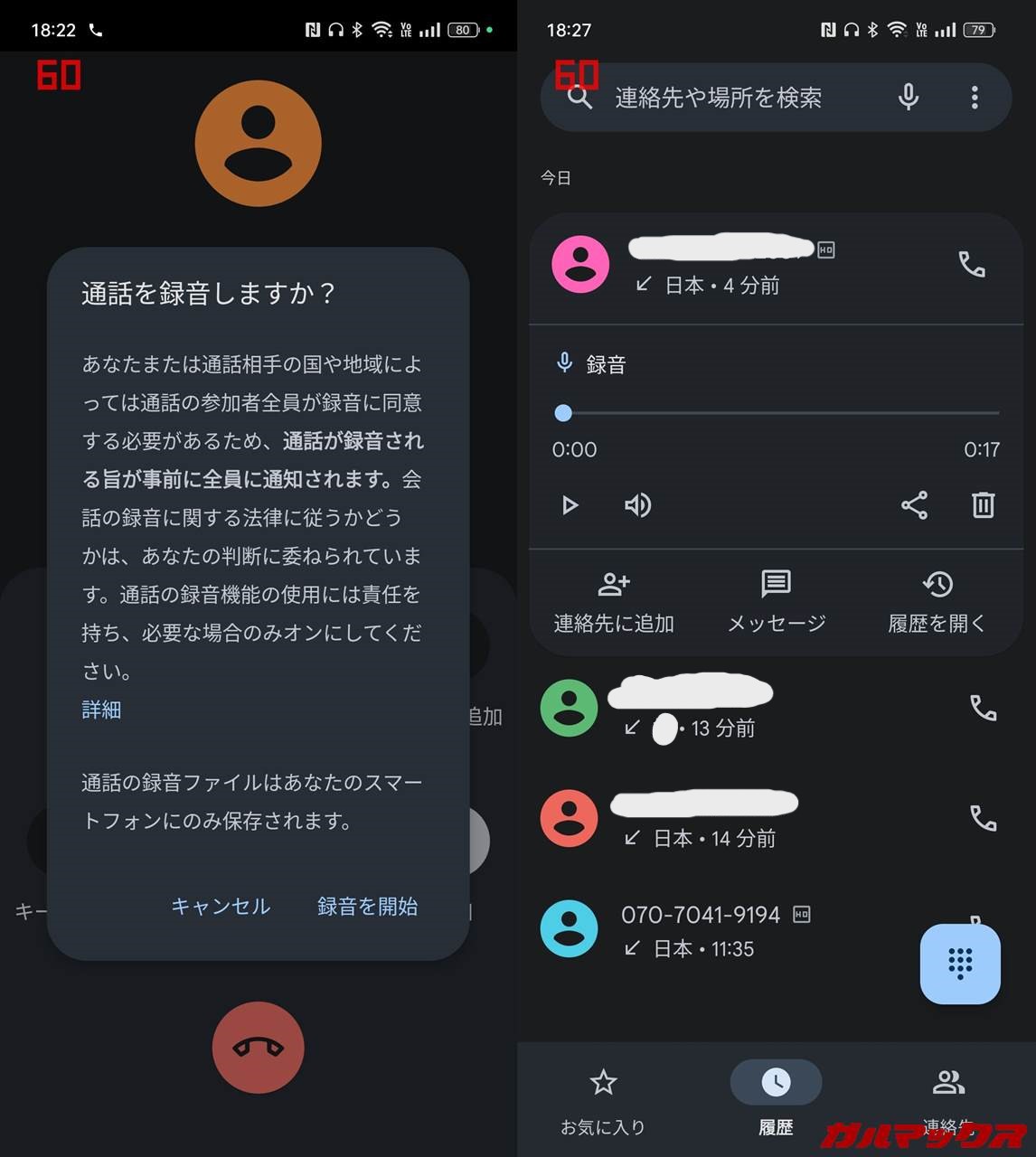 ▼この録音ファイルは電話アプリの通話履歴から確認できます。設定で特定日数(7日とか)経てば自動で消去することも可能。こりゃ便利じゃん!↓
