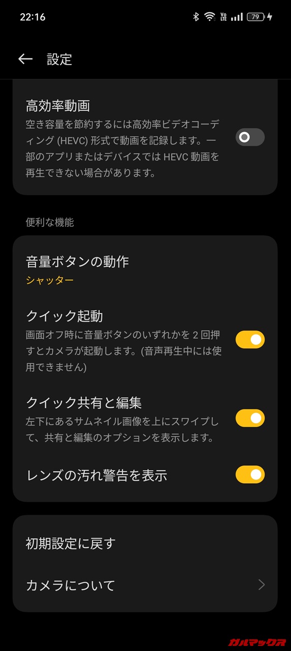 ▼一応それっぽいことはできます。音量キー2回押しでカメラのクイック起動は設定可能。ただ音楽再生中など一部のシーンでは動作しなくなるし、画面がオフの状態でしか使えません。微妙‥。↓
