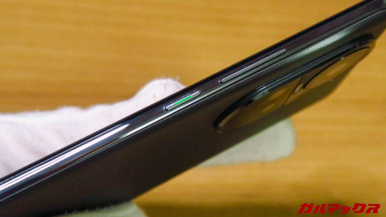 ▼側面はこんな感じ!右面にボタン類が集中。電源キーに緑のアクセントが入っているのもニヤリとさせられますね。こういう細かい部分のアクセント、作り込まれてる感あって好きです。↓