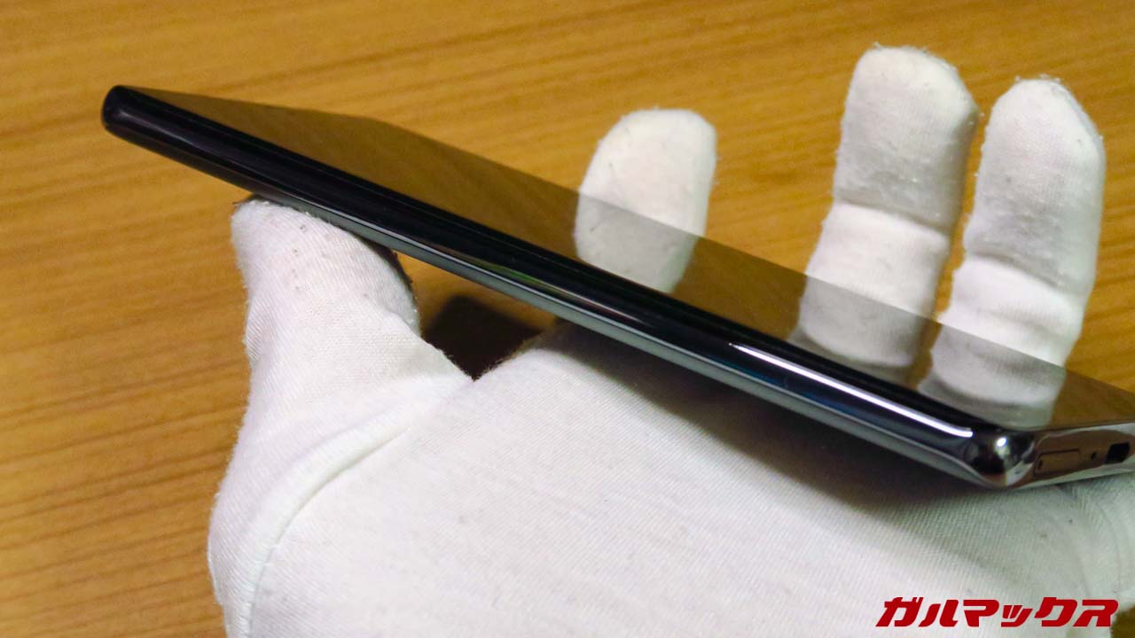 ▼エッジディスプレイ形状なので好みは分かれるのですが、見栄えで言えば高級感あって良いもんですね(`・ω・´)。側面操作はしにくい反面、丸っこくなっていることで手にカドが当たらないので持ち心地の良さにも一役買っています。↓
