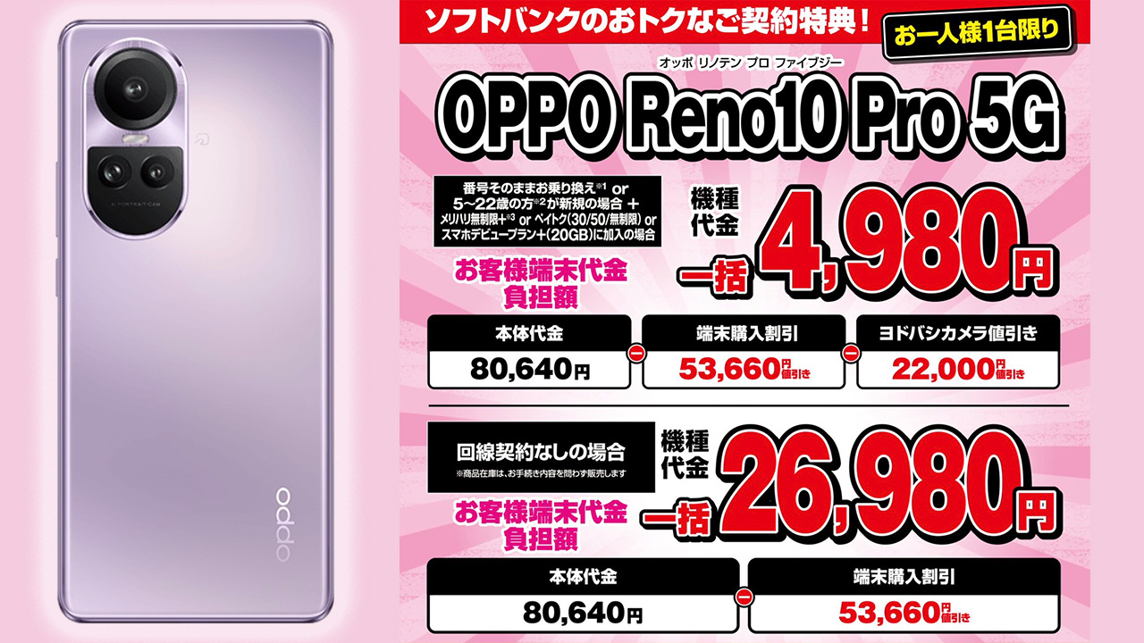 [返却無し]OPPO Reno10 Pro 5Gが一括4,980円、端末のみは26,980円。ヨドバシ秋葉原店にて