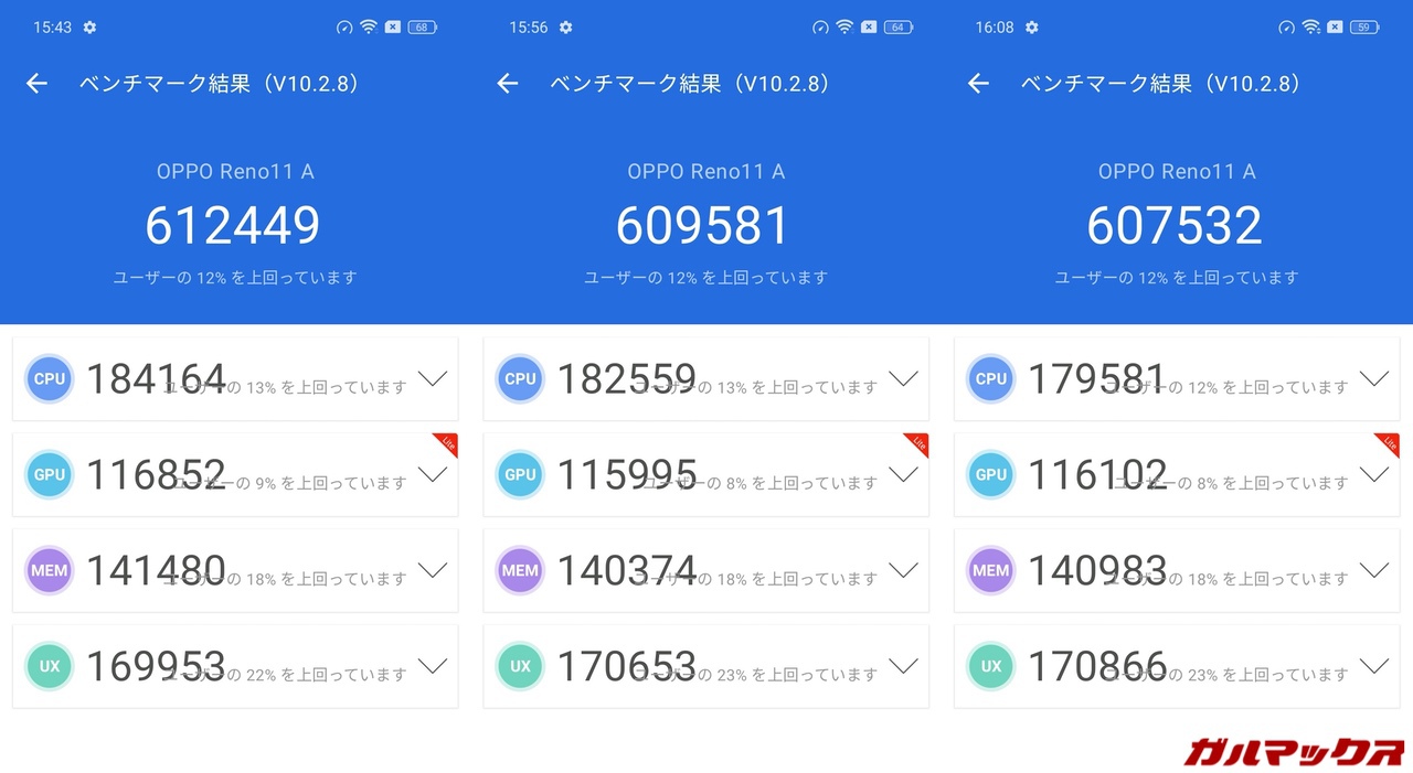 ▼AnTuTuを3回連続で走らせた結果は以下!何故か温度が表示されてませんが、スコア自体は大きく下がってないのでサーマルスロットリングは発生していない様子。まあミドルSoCなので熱は穏やかですわな。↓