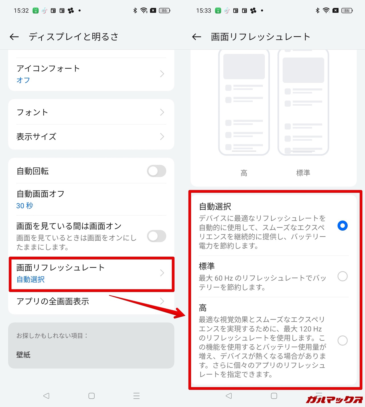 自動設定だと60Hzと120Hzの間くらいの電池持ちになると思うので、特にこだわりなければ高リフレッシュレート設定はデフォルトの自動設定で良いかと思います。