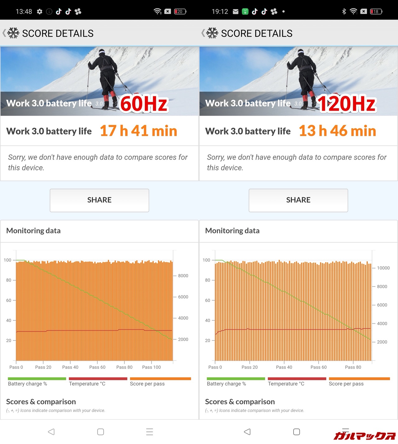 画面の更新回数が60回から120回に増えると、やっぱり電池持ちは結構影響してきますね〜。