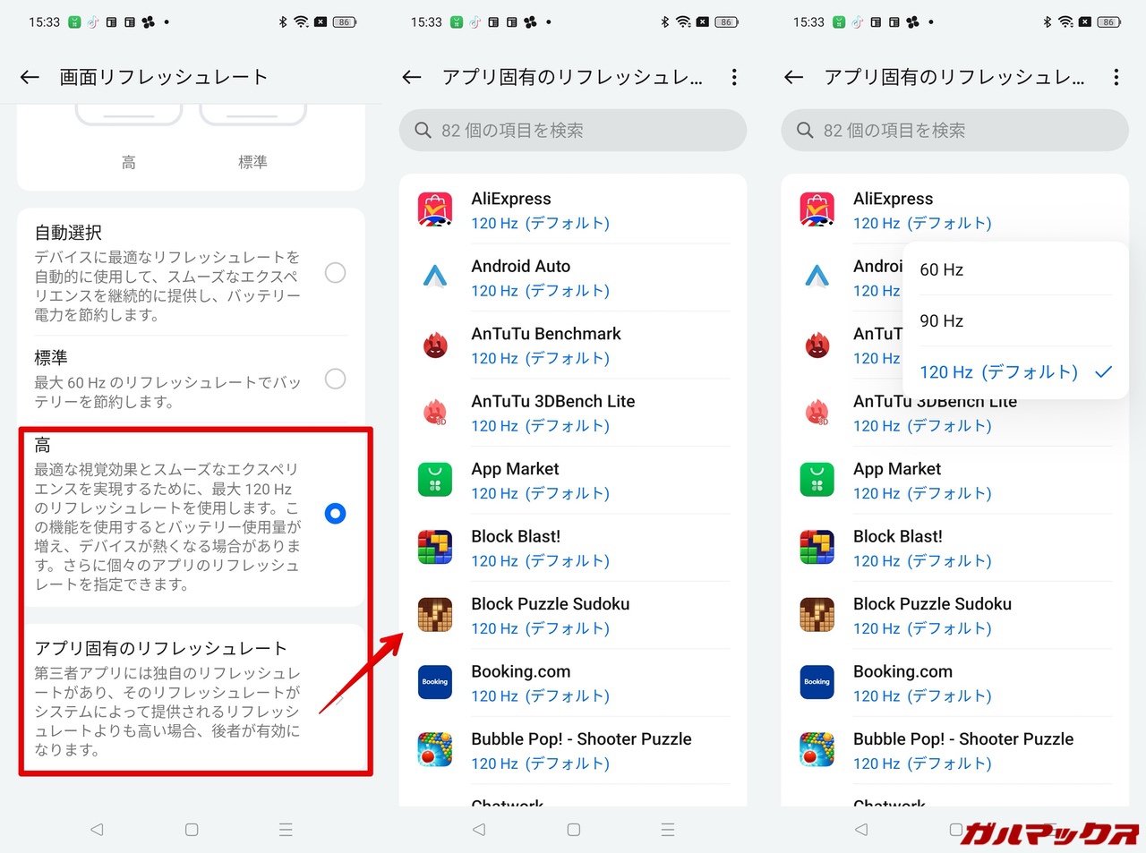 ▼アプリ固有のリフレッシュレートでは、60Hz、90Hz、120Hzをアプリごとに設定できるようになってます。