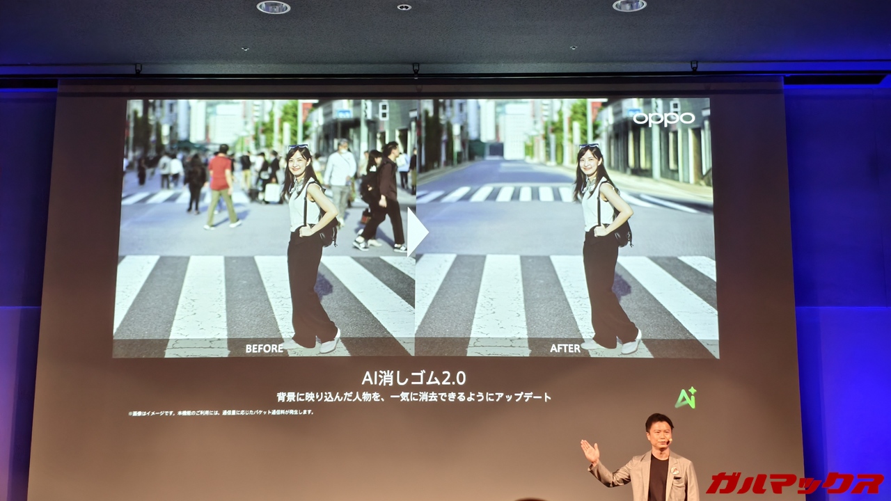 ▼例えば背景の群衆をまるごと消去するAI消しゴムや反射除去、鮮明度強化といった機能が使えます。OPPO AIについては後述。↓