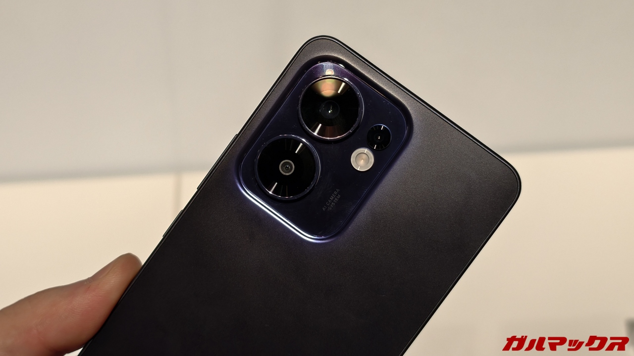 OPPO Reno13 Aの見た目からデュアルカメラっぽさ満々なんだけど、実はトリプルカメラ。メイン+超広角+マクロの組み合わせとなっています。