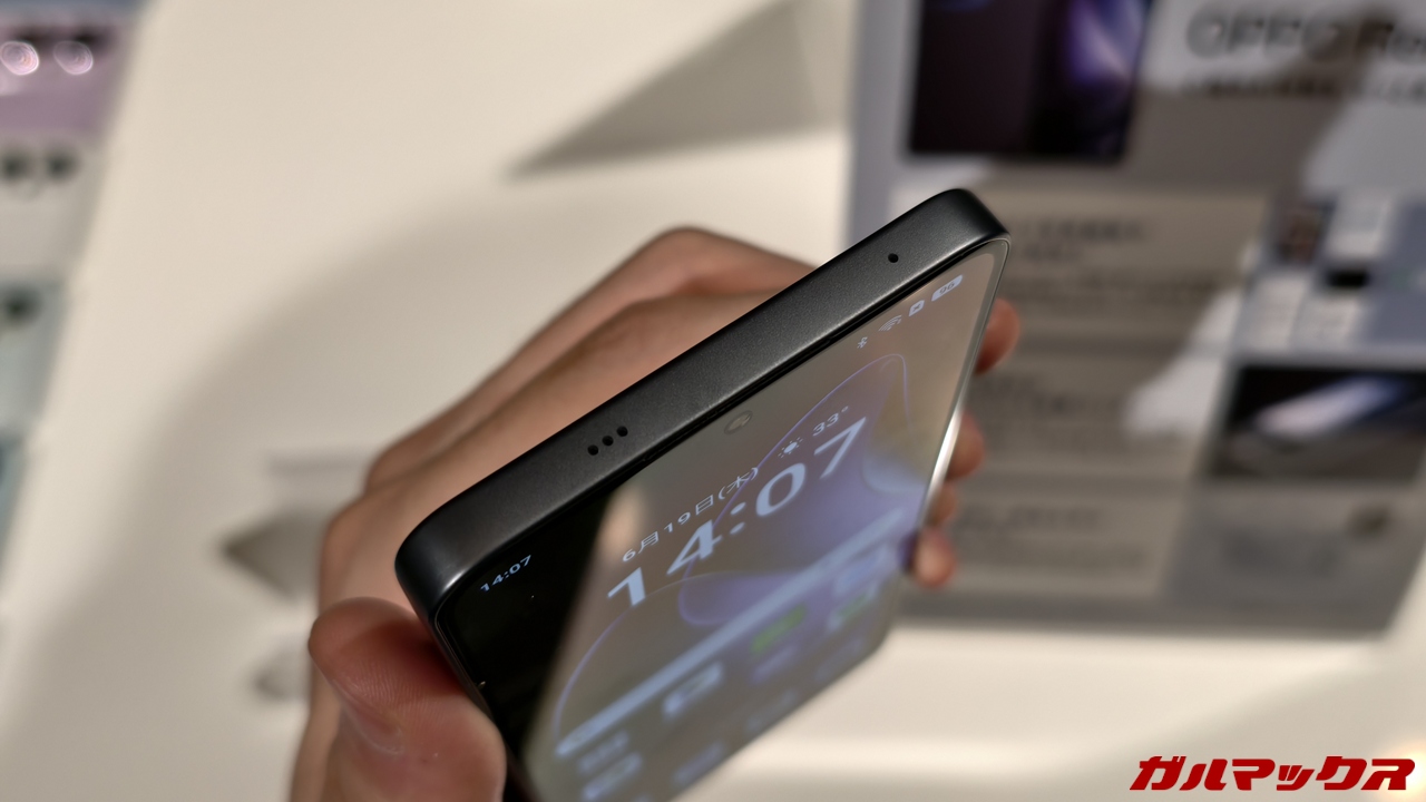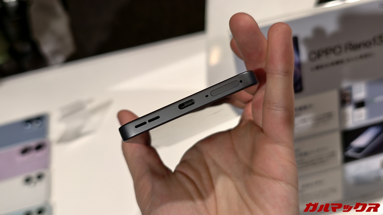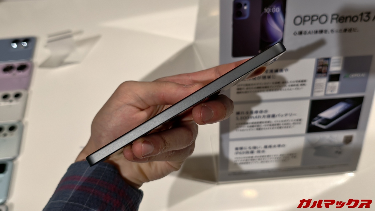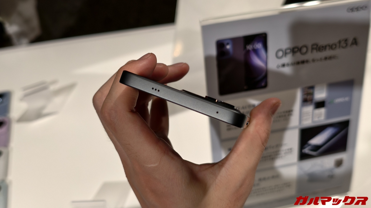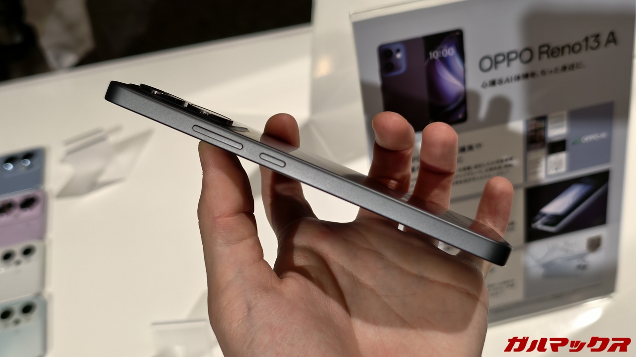 ▼OPPOはたまに左側に音量キーを配置してるんだけど、今回のOPPO Reno13 Aは右側に集中している一般的な配置でした。位置自体は高くはないけど、低くもない、平均的な印象。手がデカければ押しやすいタイプ。↓