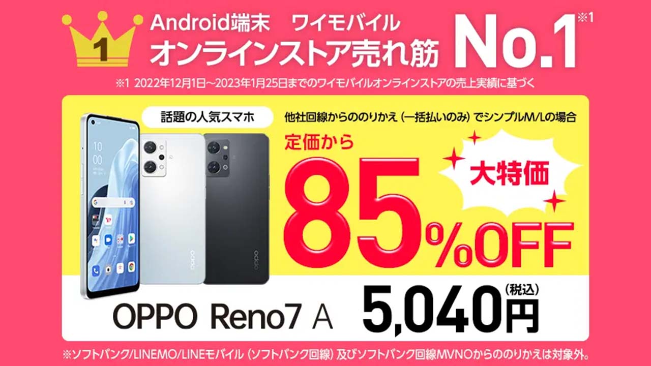 ワイモバでOPPO Reno7 AがMNP一括5,040円!Snapdragon 695搭載モデル!