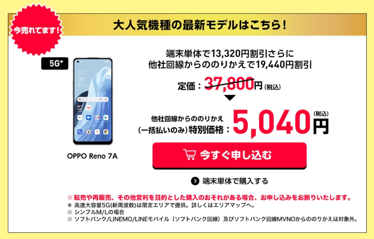 OPPO Reno7 Aは以下から購入できます。乗り換える場合は、乗り換え元キャリアでMNP予約番号の発行などの手続きも忘れずにどうぞ。