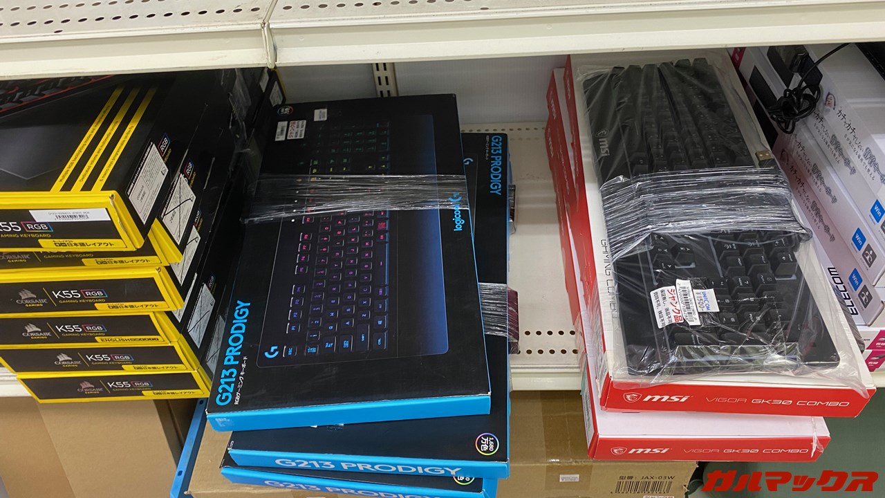 店舗奥のコーナーにてキーボード、マウス、ヘッドセットなど各種ゲーミングデバイスが販売されていることを確認した。