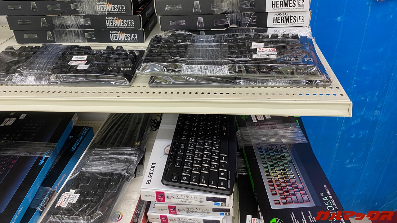 ▼GAMDIAS HERMES E2は1,000円、GAMDIAS HERMES E3は1,600円。Razer Cynosa V2が2,500円。チラッと紛れているELECOMのキーボードが浮いているなぁ…↓