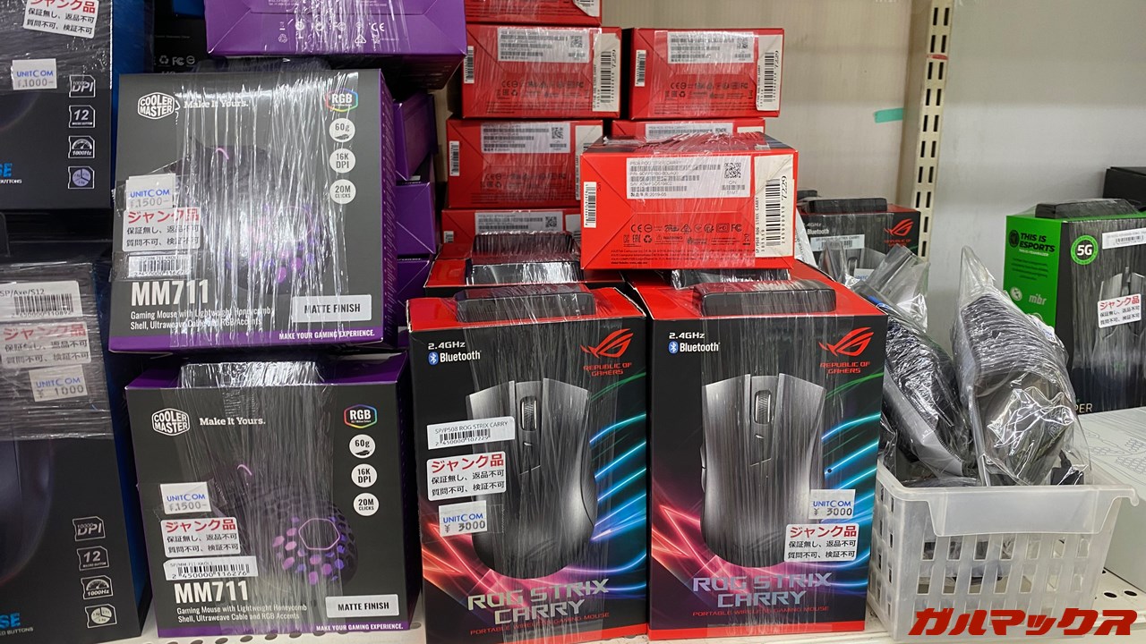 ▼軽量なCoolerMaster MM711は1,500円、無線ゲーミングマウスのROG STRIX CARRYは3,000円。↓