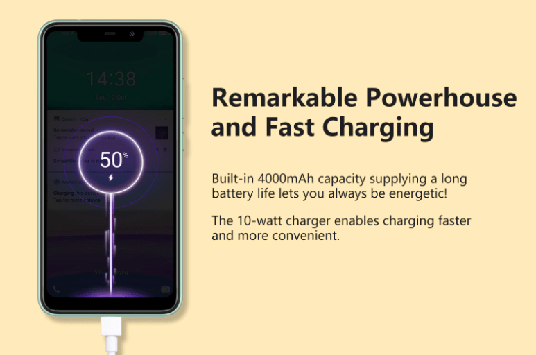 ▼OUKITEL C22のバッテリー容量に関してはエントリークラスながら4000mAhと比較的大容量!また急速充電10Wにも対応しており、電池周りの部分はなかなかイイカンジ。↓