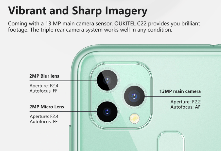 ▼OUKITEL C22はエントリーモデルながらもトリプルカメラを搭載!構成は1,300万画素のメインカメラ、サブに200万画素のマクロカメラ、200万画素の深度測定カメラとなっております!↓
