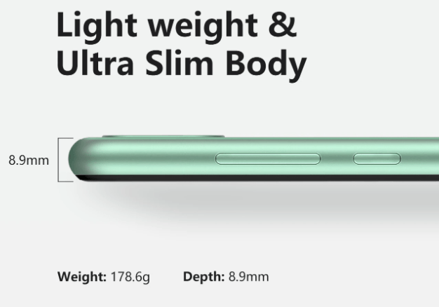 ▼本体サイズは縦横の大きさが非公表。厚さが8.9mm、重さは178.6gと比較的軽量に仕上がっております!またカメラユニットがかなり薄いのも特徴。↓