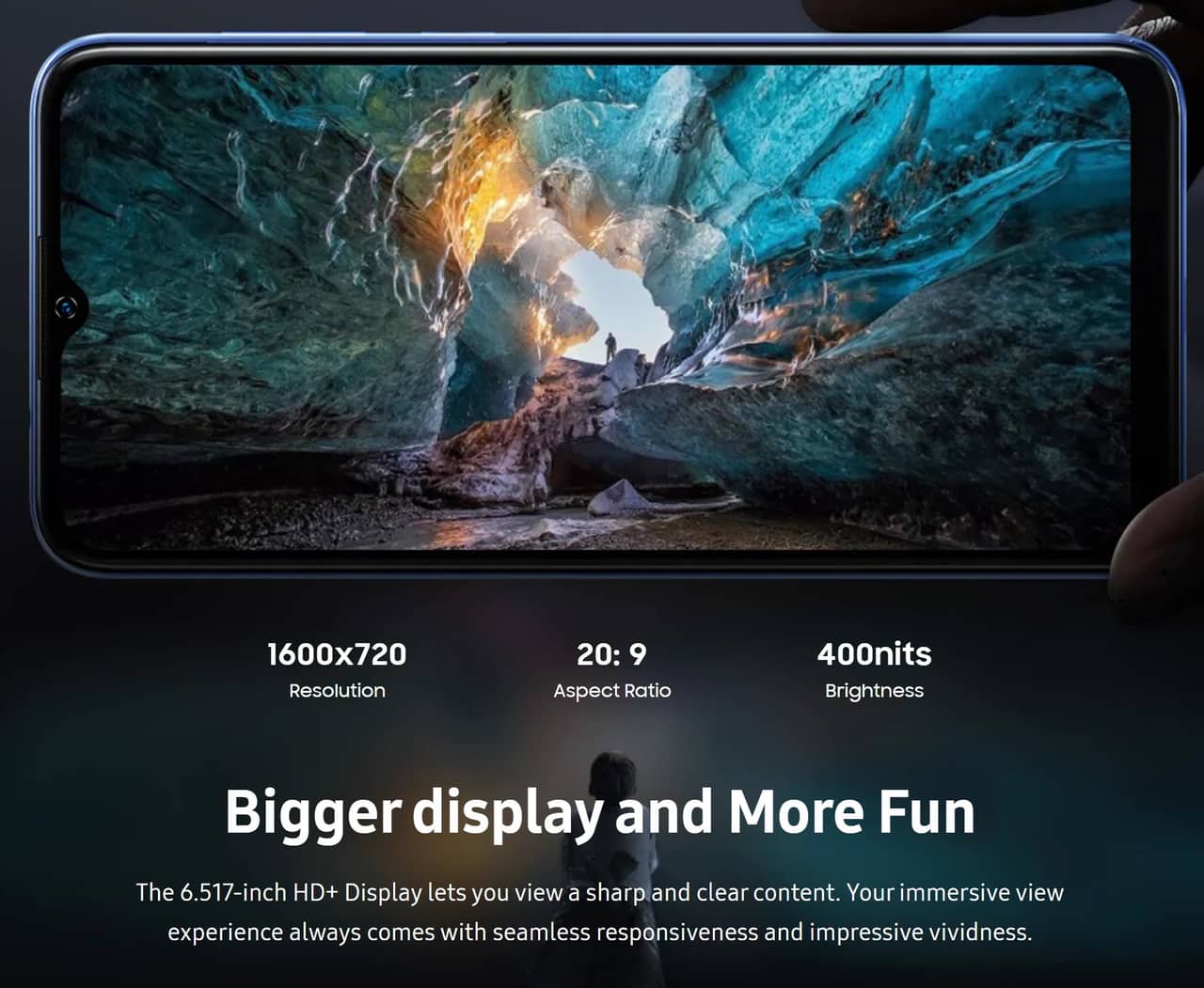▼ディスプレイは大型サイズな6.5インチサイズ。解像度はやはりHD+クラスで低めなのでドットの粗さは感じそうです。解像度が低い分消費電力は低いので、後述の大容量バッテリーも相まって電池持ちは期待できるかもしれませんね。↓