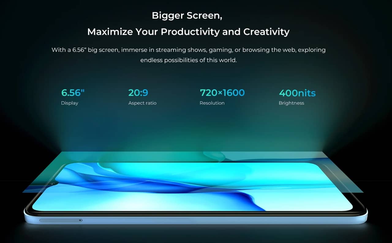 OUKITEL C35の画面はサイズが6.56インチ、解像度は1,600×720、ディスプレイは液晶を採用しています。画面形状はノッチ(水滴)となります。