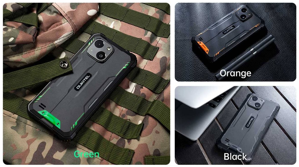 OUKITEL G2のカラーリングは3つあり、アクセントカラーが変わるタイプ。グリーン、オレンジそしてブラックとなっています。