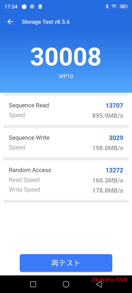 ▼ストレージ速度は読み込みが895.9MB/s、書き込みが198MB/s。アプリの起動などに直結する読み込み速度が速い!↓