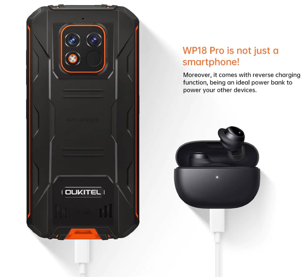 ▼大容量をイカして他のデバイスへの逆充電にも対応!OUKITEL WP18 Proはまさにモバイルバッテリーそのものにもなれるスマホ…というワケっす。イヤホンや他スマホの充電が切れても安心。↓