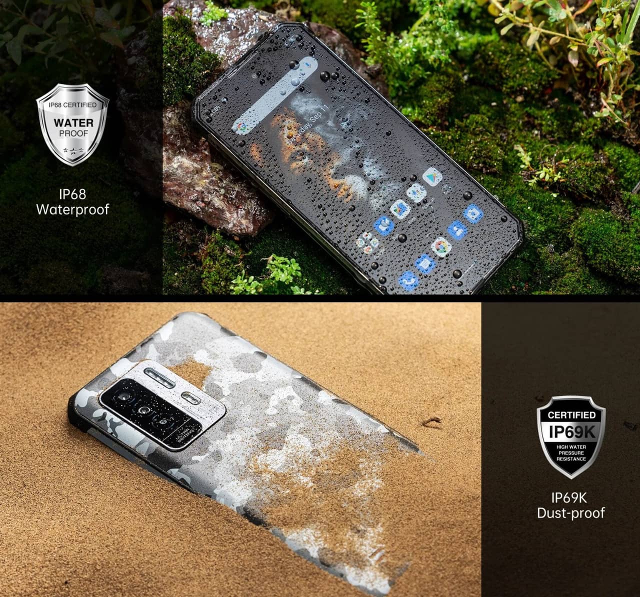 ▼防水防塵は最高クラスのIP69Kで水濡れも砂もバッチリ持ちこたえてくれます。耐衝撃等級はMIL-STD-810Gで、多くのタフネスが得ている810Hよりは下のランクなのでその点は注意です。おそらく上述のパネルの都合がここに出てるのでしょう。↓