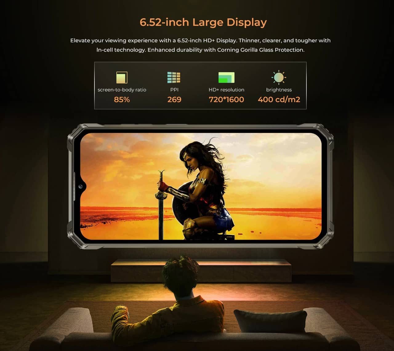 OUKITEL WP28の画面はサイズが6.52インチ、解像度は1,600×720、ディスプレイは液晶を採用しています。画面形状はノッチ(水滴)となります。