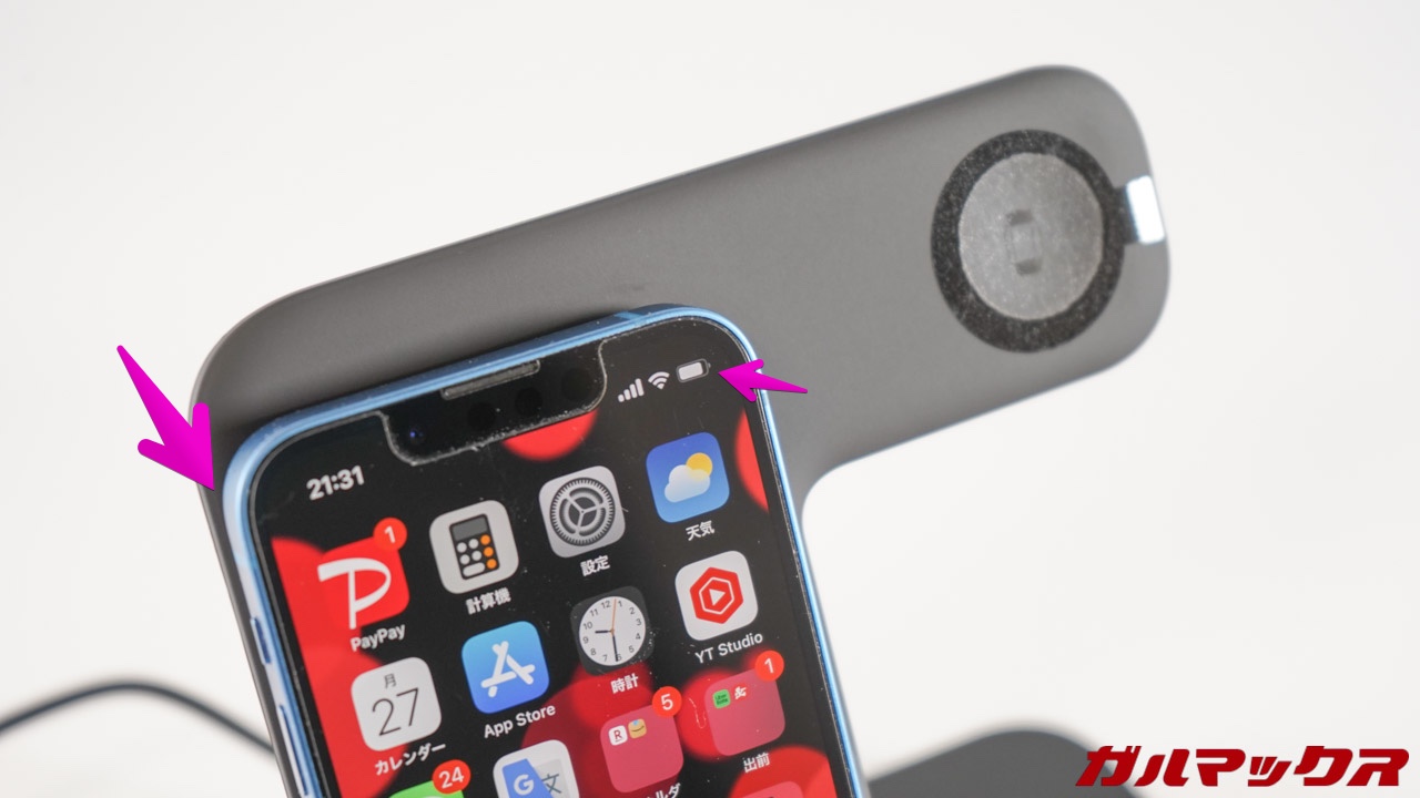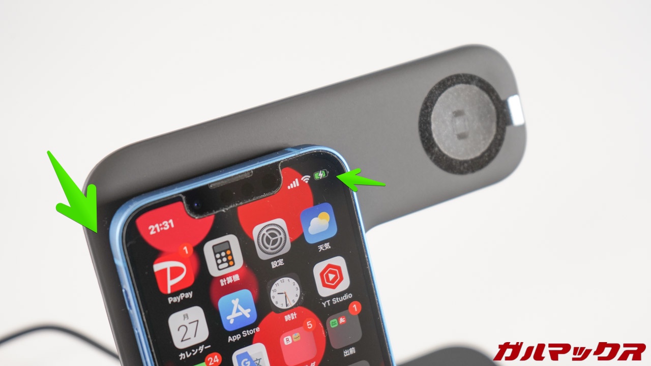 ▼iPhone 13 miniを置いてみたら…あれ、充電されない!なんでだ?!と思いながら位置をちょっとズラすとあら不思議、ちゃんと充電できた。↓