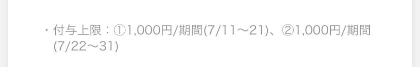 PayPayに関しては3社合同の7/21までの期間が終わっても7/31まで同様のキャンペーンが続きます。PayPayボーナスの付与上限は1000円で7/21までのものとは別枠になります。