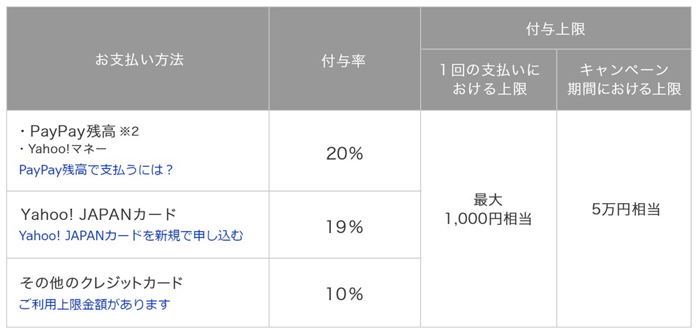 ▼今回の第2弾100億円キャンペーンでは支払い方法により還元率が変わるので”最大”表記が付け加えられておりました!銀行口座などを登録してチャージを行うPayPay残高での支払いは付与率が20%、Yahoo!JAPANカードでの支払いは付与率19%、その他のクレジットカードであれば付与率10%。↓