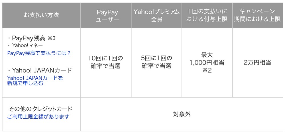 まずキャンペーンを最大限に活用するには支払い方法をクレジットカード以外のPayPay残高支払い+Yahoo!プレミアム会員が最もお得に今回のキャンペーンを利用できます。
