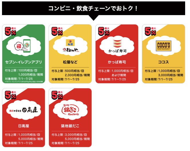 - ストアによって「夏のPayPayジャンボ抽選」が「3回に1回の確率」で行われる。1等なら決済金額の100%のPayPayボーナス還元がもらえる