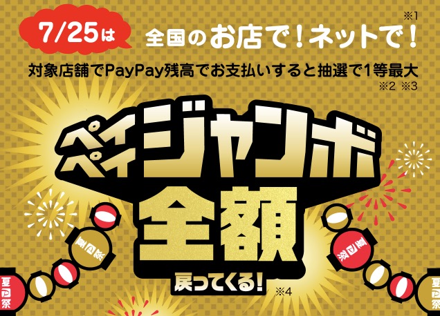 - 7月25日最終日は「夏のPayPay祭フィナーレジャンボ」が開催され、対象なら実店舗、ネット問わずPayPayで支払いを行えば抽選。1等なら決済金額の100%のPayPayボーナス還元がもらえる