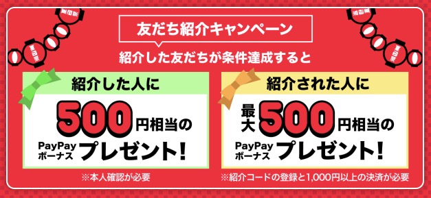- 友達や家族などにPayPayを紹介すれば、紹介した人もされた人も500円のPayPayボーナスがもらえる