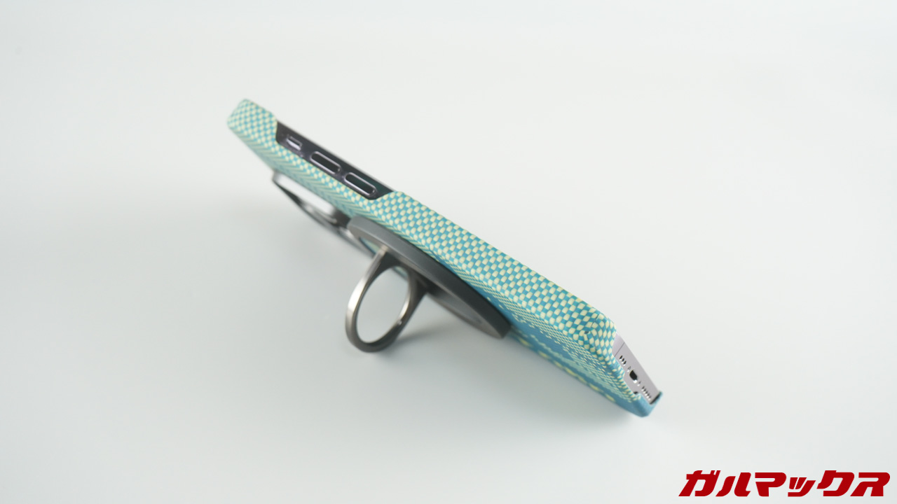 ▼MagEZ Gripはケースの背面に磁石で引っ付くようになっているので簡単に取り付け・取り外しできますが、磁力が強めなので利用中に外れる心配は有りませんでした。また、スタンドとしても利用できます。↓