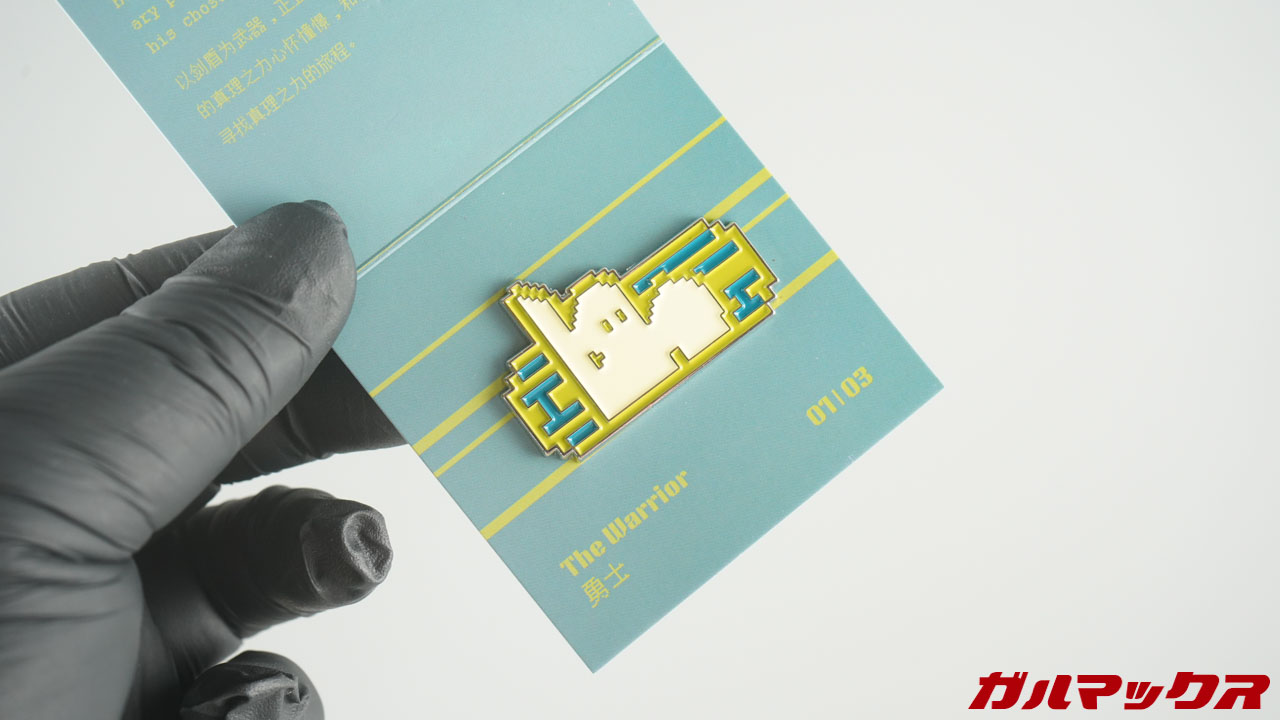 ▼バッジは別途付属していました。僕に届いたのはこんなデザイン。ちなみにバッジは穴を開けるピンバッジではなく磁石で挟むタイプでした。↓